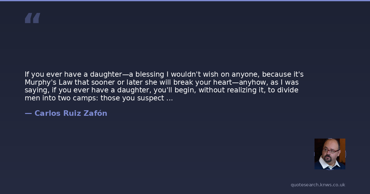 If you ever have a daughter—a blessing I wouldn't wish on anyone, because it's Murphy's Law that sooner or later she will break your heart—anyhow, as I was saying, if you ever have a daughter, you'll begin, without realizing it, to divide men into two camps: those you suspect are sleeping with her and those you don't. Whoever says that's not true is lying through his teeth.