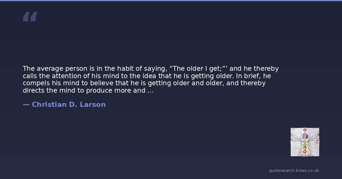 The average person is in the habit of saying, “The older I get;”’ and he thereby calls the attention of his mind to the idea that he is getting older. In brief, he compels his mind to believe that he is getting older and older, and thereby directs the mind to produce more and more age. The true expression in this connection is, “The longer I live.” This expression calls the mind’s attention to the length of life, which will, in turn, tend to increase the power of that process in you that can prolong life. When people reach the age of sixty or seventy, they usually speak of “the rest of my days,” thus implying the idea that there are only a few more days remaining. The mind is thereby directed to finish life in a short period of time, and accordingly, all the forces of the mind will proceed to work for the speedy termination of personal existence. The correct expression is “from now on,” as, that leads thought into the future indefinitely without impressing the mind with any end whatever.
