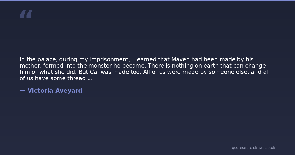 In the palace, during my imprisonment, I learned that Maven had been made by his mother, formed into the monster he became. There is nothing on earth that can change him or what she did. But Cal was made too. All of us were made by someone else, and all of us have some thread of steel that nothing and no one can cut. I thought Cal was immune to the corruptive temptation of power. How wrong I was. He was born to be a king. It's what he was made for. It's what he was made to want.