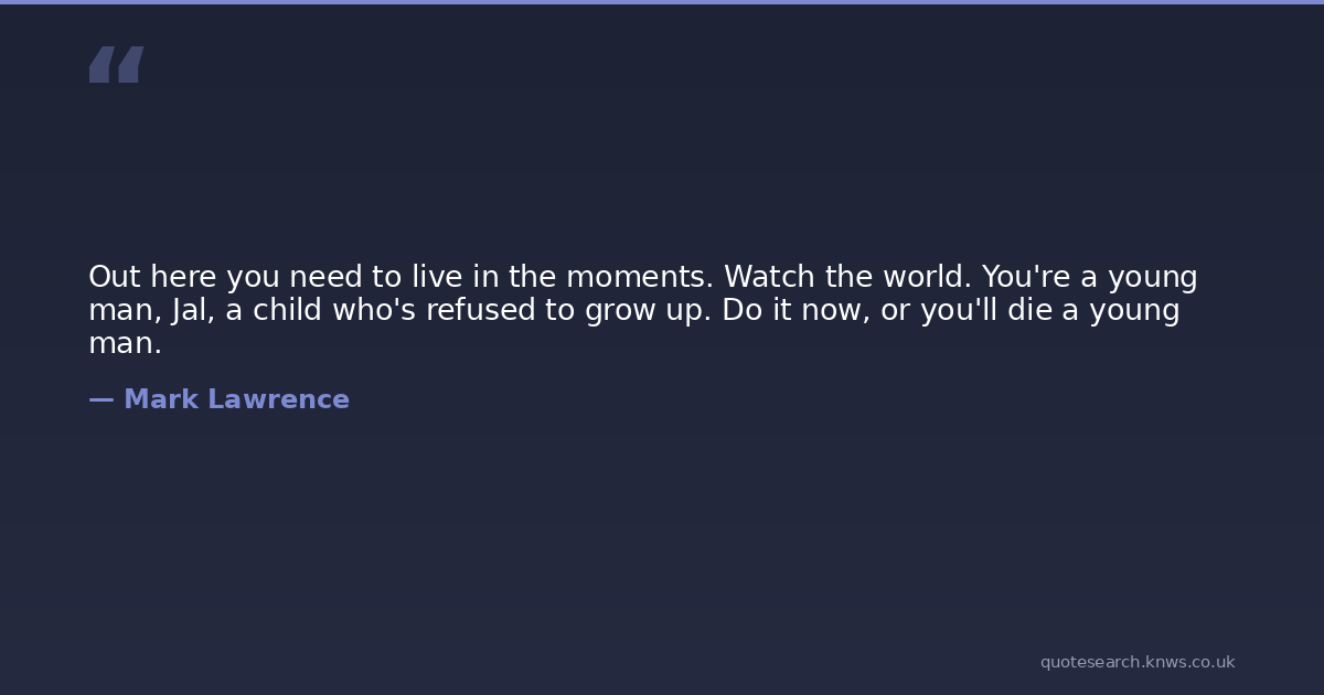 Out here you need to live in the moments. Watch the world. You're a young man, Jal, a child who's refused to grow up. Do it now, or you'll die a young man.