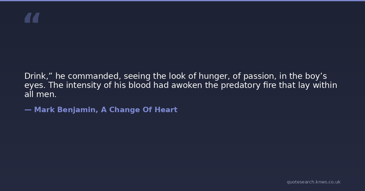 Drink,” he commanded, seeing the look of hunger, of passion, in the boy’s eyes. The intensity of his blood had awoken the predatory fire that lay within all men.
