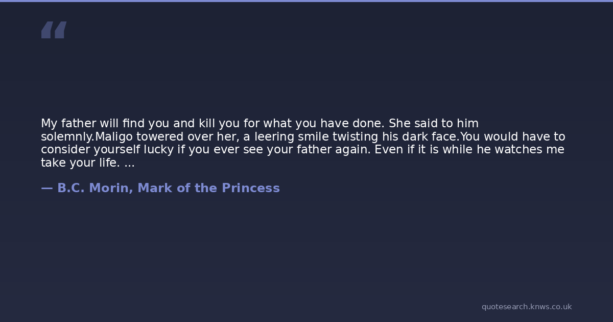 My father will find you and kill you for what you have done. She said to him solemnly.Maligo towered over her, a leering smile twisting his dark face.You would have to consider yourself lucky if you ever see your father again. Even if it is while he watches me take your life. He snarled, allowing a haughty smirk creep across his face.