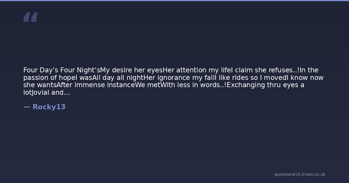 Four Day’s Four Night’sMy desire her eyesHer attention my lifeI claim she refuses..!In the passion of hopeI wasAll day all nightHer ignorance my fallI like rides so I movedI know now she wantsAfter immense instanceWe metWith less in words..!Exchanging thru eyes a lotJovial and congenialAll day all nightI claim again..!Response remains..?My hope is my ecstasyYour woe is your waitI hope…!You sense the harmonyOf my bond on two wheelsYou will alwaysMy first loveTill the ceaseI loved youAll days all nights