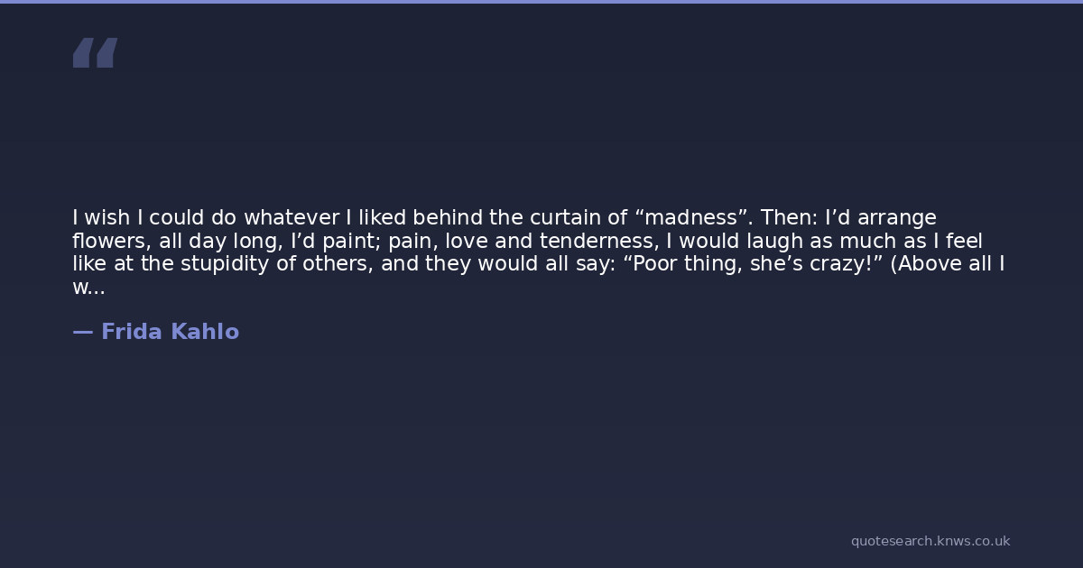 I wish I could do whatever I liked behind the curtain of “madness”. Then: I’d arrange flowers, all day long, I’d paint; pain, love and tenderness, I would laugh as much as I feel like at the stupidity of others, and they would all say: “Poor thing, she’s crazy!” (Above all I would laugh at my own stupidity.) I would build my world which while I lived, would be in agreement with all the worlds. The day, or the hour, or the minute that I lived would be mine and everyone else’s - my madness would not be an escape from “reality”.