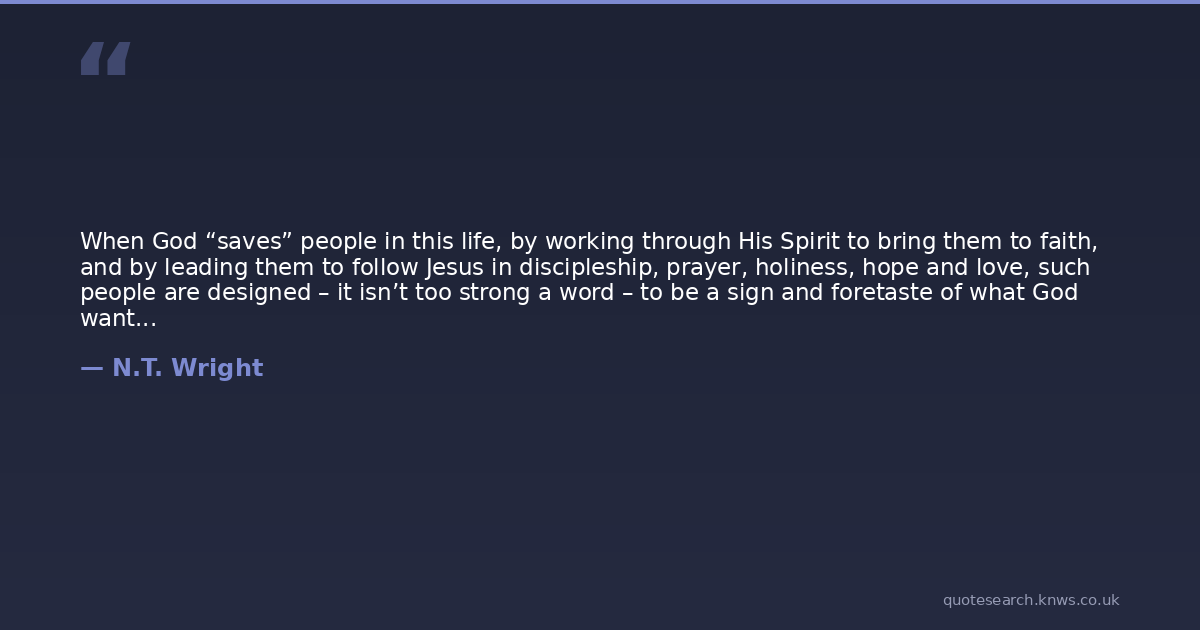 When God “saves” people in this life, by working through His Spirit to bring them to faith, and by leading them to follow Jesus in discipleship, prayer, holiness, hope and love, such people are designed – it isn’t too strong a word – to be a sign and foretaste of what God wants to do for the entire cosmos. What’s more, such people are not just to be a sign and foretaste of that ultimate “salvation”; they are to be part of the means by which God makes this happen in both the present and the future.