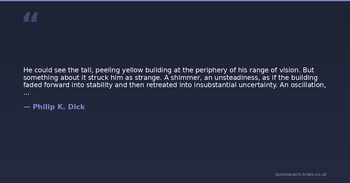 He could see the tall, peeling yellow building at the periphery of his range of vision. But something about it struck him as strange. A shimmer, an unsteadiness, as if the building faded forward into stability and then retreated into insubstantial uncertainty. An oscillation, each phase lasting a few seconds and then blurring off into its opposite, a fairly regular variability as if an organic pulsation underlay the structure. As if, he thought, it's alive.