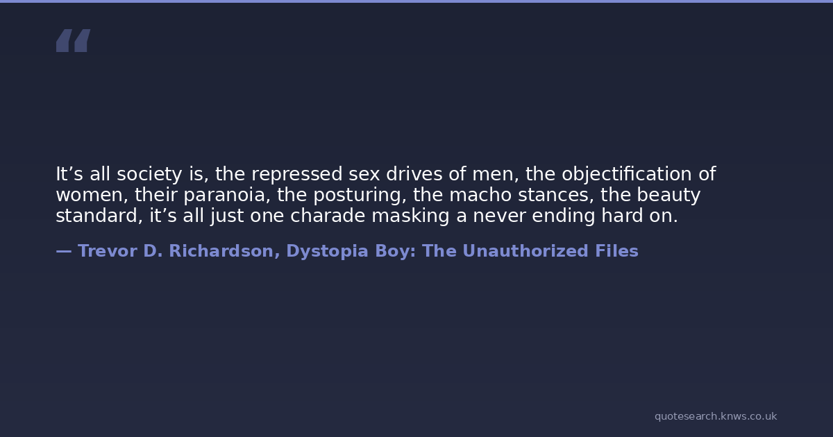It’s all society is, the repressed sex drives of men, the objectification of women, their paranoia, the posturing, the macho stances, the beauty standard, it’s all just one charade masking a never ending hard on.