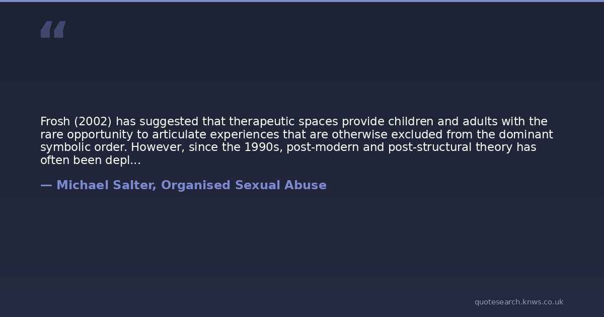 Frosh (2002) has suggested that therapeutic spaces provide children and adults with the rare opportunity to articulate experiences that are otherwise excluded from the dominant symbolic order. However, since the 1990s, post-modern and post-structural theory has often been deployed in ways that attempt to ‘manage’ from; afar the perturbing disclosures of abuse and trauma that arise in therapeutic spaces (Frosh 2002). Nowhere is this clearer than in relation to organised abuse, where the testimony of girls and women has been deconstructed as symptoms of cultural hysteria (Showalter 1997) and the colonisation of women’s minds by therapeutic discourse (Hacking 1995). However, behind words and discourse, ‘a real world and real lives do exist, howsoever we interpret, construct and recycle accounts of these by a variety of symbolic means’ (Stanley 1993: 214). Summit (1994: 5) once described organised abuse as a ‘subject of smoke and mirrors’, observing the ways in which it has persistently defied conceptualisation or explanation. Explanations for serious or sadistic child sex offending have typically rested on psychiatric concepts of ‘paedophilia’ or particular psychological categories that have limited utility for the study of the cultures of sexual abuse that emerge in the families or institutions in which organised abuse takes pace. For those clinicians and researchers who take organised abuse seriously, their reliance upon individualistic rather than sociological explanations for child sexual abuse has left them unable to explain the emergence of coordinated, and often sadistic, multi—perpetrator sexual abuse in a range of contexts around the world.