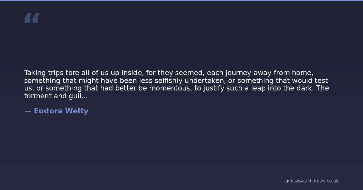 Taking trips tore all of us up inside, for they seemed, each journey away from home, something that might have been less selfishly undertaken, or something that would test us, or something that had better be momentous, to justify such a leap into the dark. The torment and guilt - the torment of having the loved one go, the guilt of being the loved one gone - comes into my fiction as it did and does in my life. And most of all the guilt then was because it was true: I had left to arrive at some future and secret joy, at what was unknown, and what was no in New York, waiting to be discovered. My joy was connected with my writing; that was as much as I knew.