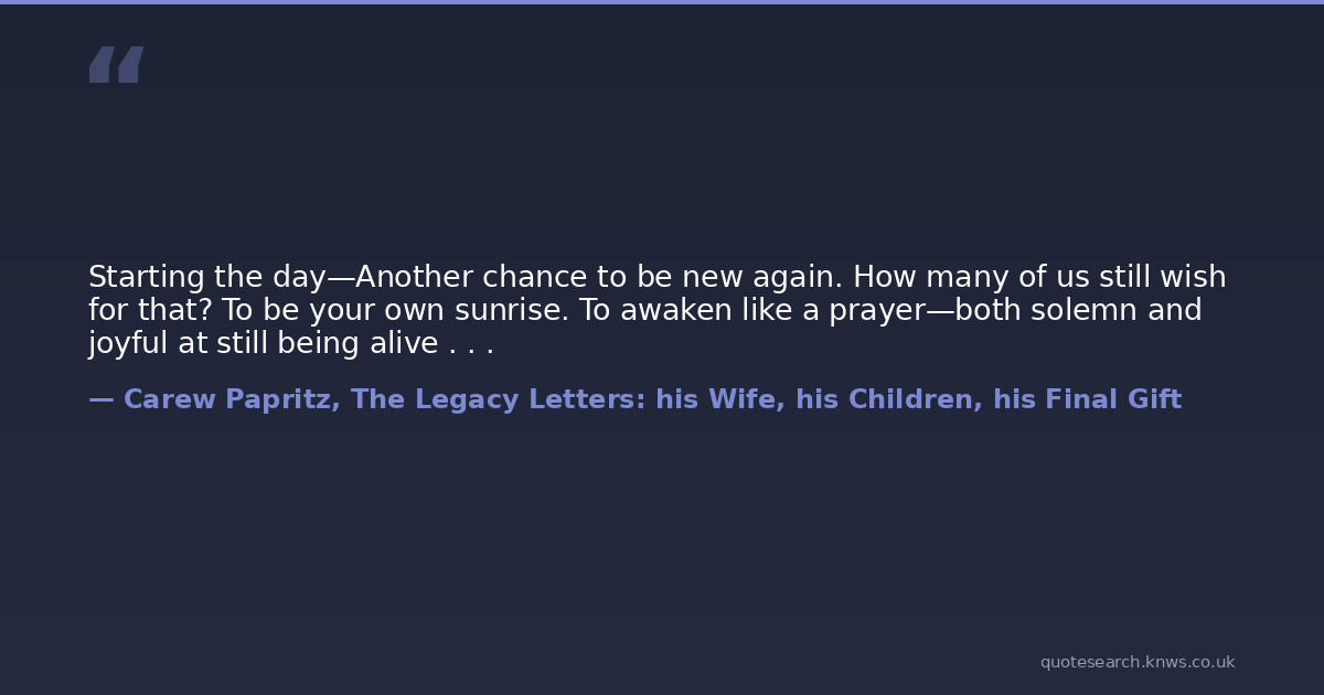 Starting the day—Another chance to be new again. How many of us still wish for that? To be your own sunrise. To awaken like a prayer—both solemn and joyful at still being alive . . .