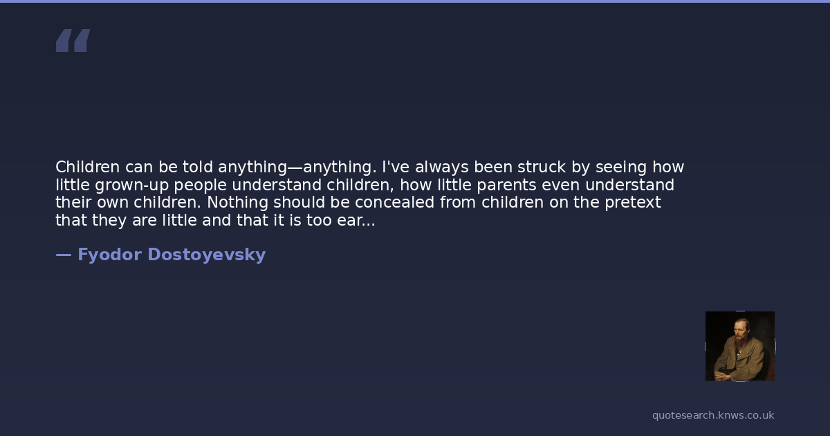 Children can be told anything—anything. I've always been struck by seeing how little grown-up people understand children, how little parents even understand their own children. Nothing should be concealed from children on the pretext that they are little and that it is too early for them to understand. What a miserable and unfortunate idea! And how readily the children detect that their fathers consider them too little to understand anything, though they understand everything. Grown-up people do not know that a child can give exceedingly good advice even in the most difficult case.