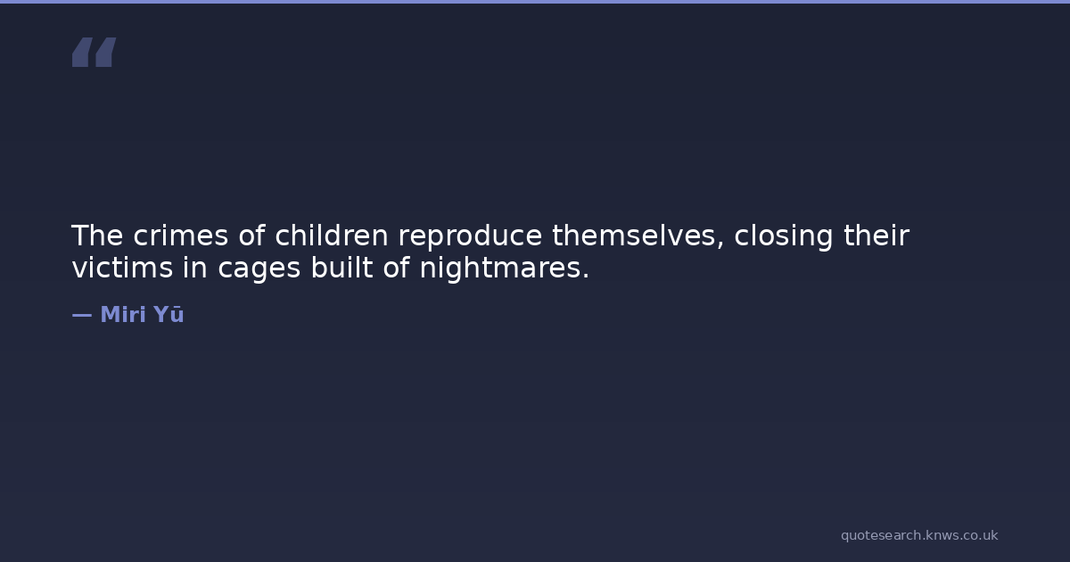 The crimes of children reproduce themselves, closing their victims in cages built of nightmares. cages children crimes nightmares Download Image Share on X Share on Facebook Copy Link