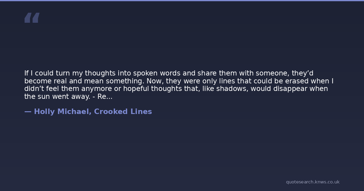 If I could turn my thoughts into spoken words and share them with someone, they’d become real and mean something. Now, they were only lines that could be erased when I didn’t feel them anymore or hopeful thoughts that, like shadows, would disappear when the sun went away. - Rebecca Meyer, Crooked Lines