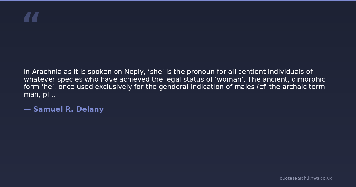 In Arachnia as it is spoken on Nepiy, ‘she’ is the pronoun for all sentient individuals of whatever species who have achieved the legal status of ‘woman’. The ancient, dimorphic form ‘he’, once used exclusively for the genderal indication of males (cf. the archaic term man, pl. men), for more than a hundred-twenty years now, has been reserved for the general sexual object of ‘she’, during the period of excitation, regardless of the gender of the woman speaking or the gender of the woman referred to.