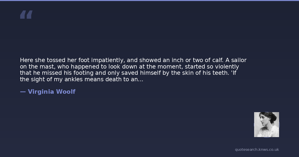 Here she tossed her foot impatiently, and showed an inch or two of calf. A sailor on the mast, who happened to look down at the moment, started so violently that he missed his footing and only saved himself by the skin of his teeth. 'If the sight of my ankles means death to an honest fellow who, no doubt, has a wife and family to support, I must, in all humanity, keep them covered,' Orlando thought. Yet her legs were among her chieftest beauties. And she fell to thinking what an odd pass we have come to when all a woman's beauty has to be kept covered lest a sailor fall from a mast-head. 'A pox on them!' she said, realizing for the first time what, in other circumstances, she would have been taught as a child, that is to say, the sacred responsibilities of womanhood...