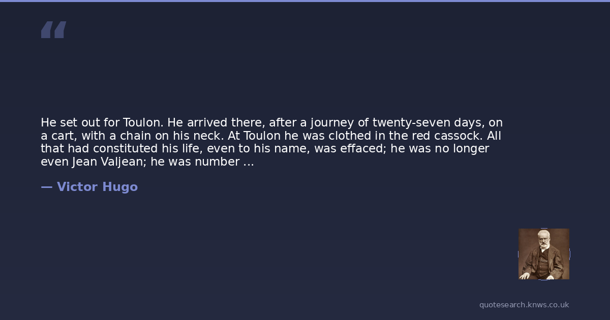 He set out for Toulon. He arrived there, after a journey of twenty-seven days, on a cart, with a chain on his neck. At Toulon he was clothed in the red cassock. All that had constituted his life, even to his name, was effaced; he was no longer even Jean Valjean; he was number 24,601.