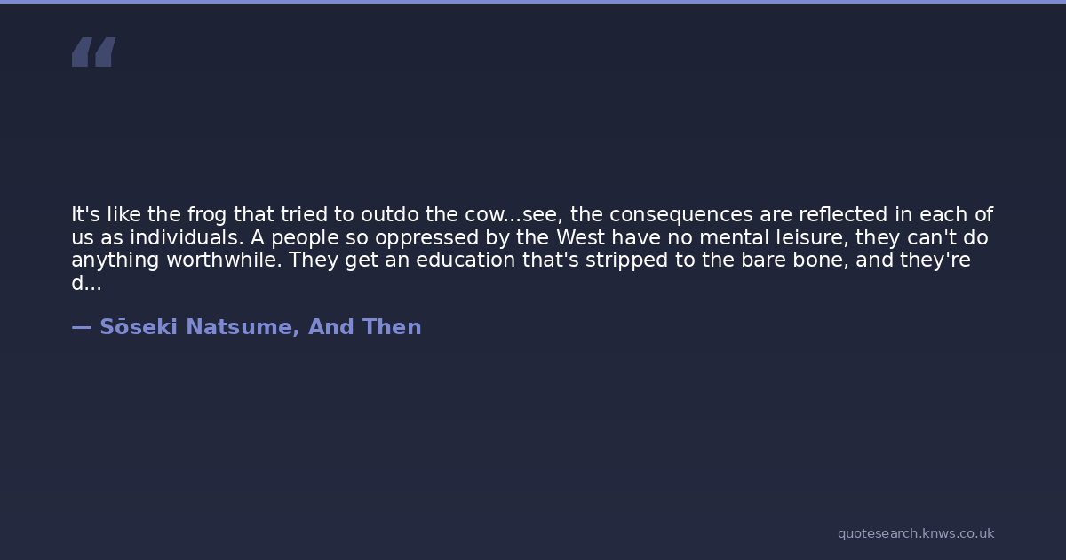 It's like the frog that tried to outdo the cow...see, the consequences are reflected in each of us as individuals. A people so oppressed by the West have no mental leisure, they can't do anything worthwhile. They get an education that's stripped to the bare bone, and they're driven with their noses to the grindstone until they're dizzy -- that's why they all end up with nervous breakdowns. Try talking to them -- they're usually stupid. They haven't thought about a thing beyond themselves, that day, that very instant. They're too exhausted to think about anything else; it's not their fault. Unfortunately, exhaustion of the spirit and deterioration of the body come hand-in-hand. And that's not all. The decline of morality has set in too. Look where you will in this country, you won't find one square inch of brightness. It's all pitch black. So what difference would it make...