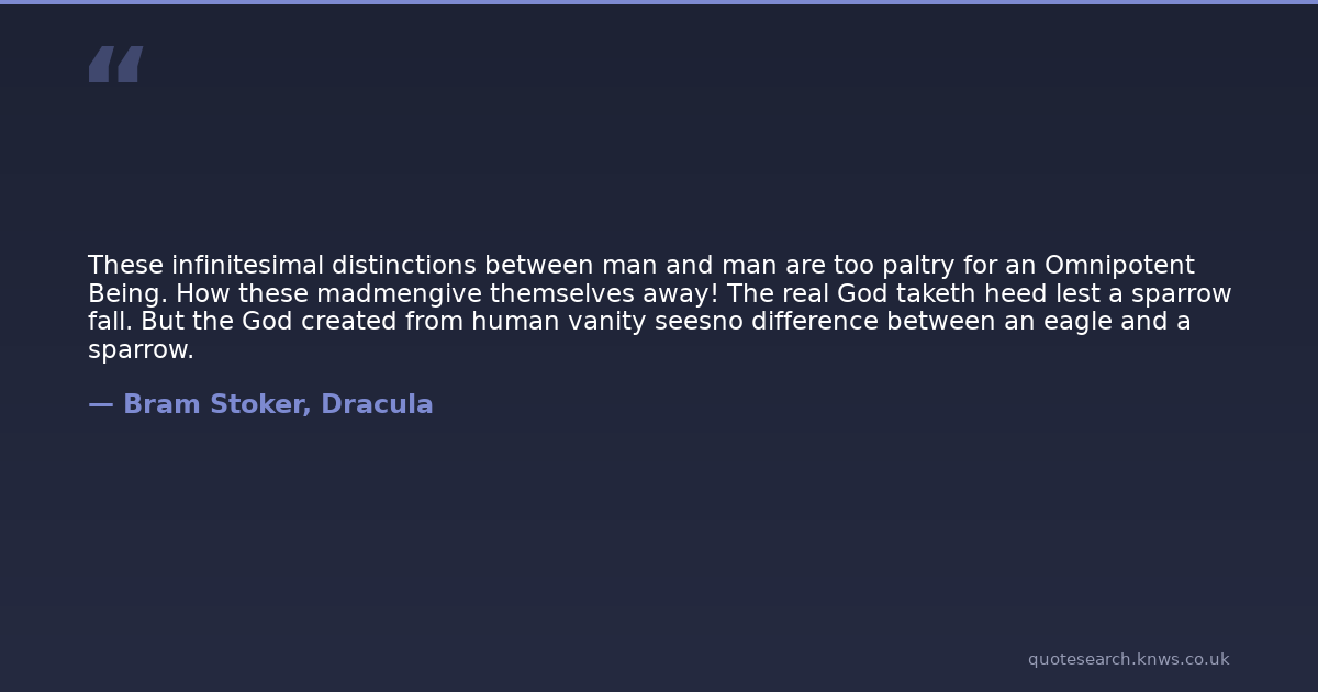 These infinitesimal distinctions between man and man are too paltry for an Omnipotent Being. How these madmengive themselves away! The real God taketh heed lest a sparrow fall. But the God created from human vanity seesno difference between an eagle and a sparrow.