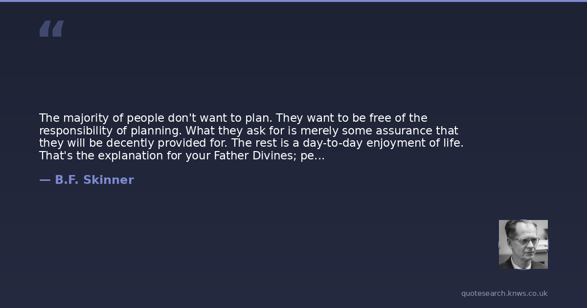 The majority of people don't want to plan. They want to be free of the responsibility of planning. What they ask for is merely some assurance that they will be decently provided for. The rest is a day-to-day enjoyment of life. That's the explanation for your Father Divines; people naturally flock to anyone they can trust for the necessities of life... They are the backbone of a community--solid, trust-worthy, essential.