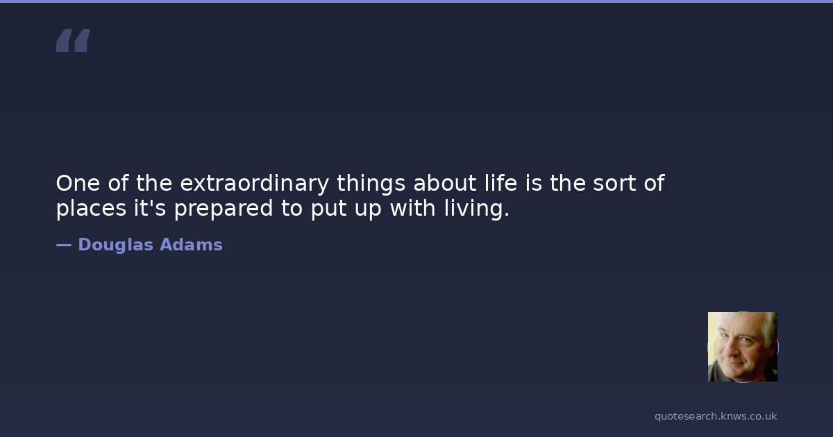 Douglas Adams was a 20th-century English writer and humorist. Douglas Noël Adams was an English author, humorist, and screenwriter, best known as the creator of The Hitchhiker's Guide to the Galaxy. Originally a 1978 BBC radio comedy, The Hitchhiker's Guide to the Galaxy evolved into a "trilogy" of six books which sold more than 14 million copies in his lifetime. Read more on Wikipedia →