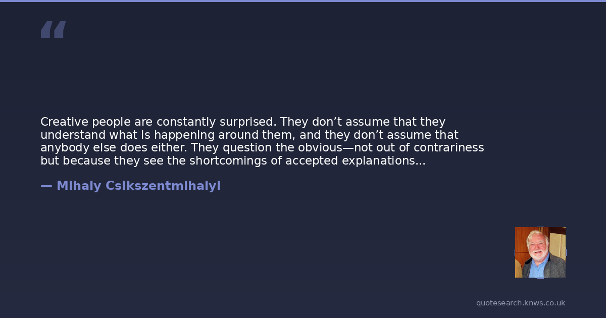 Creative people are constantly surprised. They don’t assume that they understand what is happening around them, and they don’t assume that anybody else does either. They question the obvious—not out of contrariness but because they see the shortcomings of accepted explanations before the rest of us do. They sense problems before they are generally perceived and are able to define what they are.