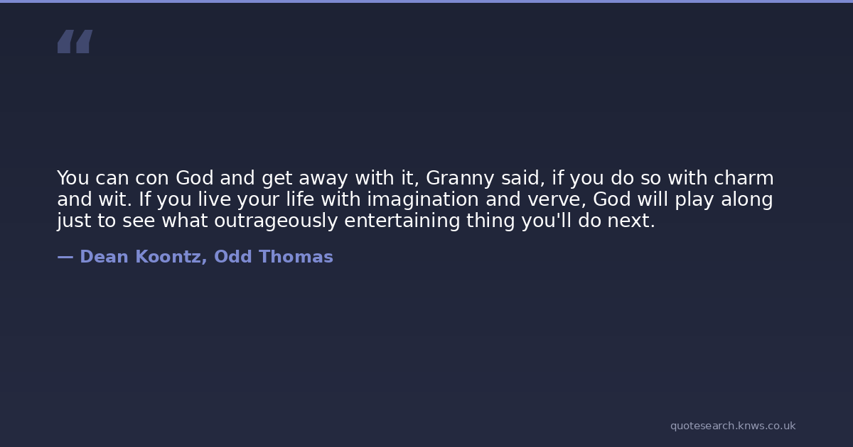 You can con God and get away with it, Granny said, if you do so with charm and wit. If you live your life with imagination and verve, God will play along just to see what outrageously entertaining thing you'll do next.
