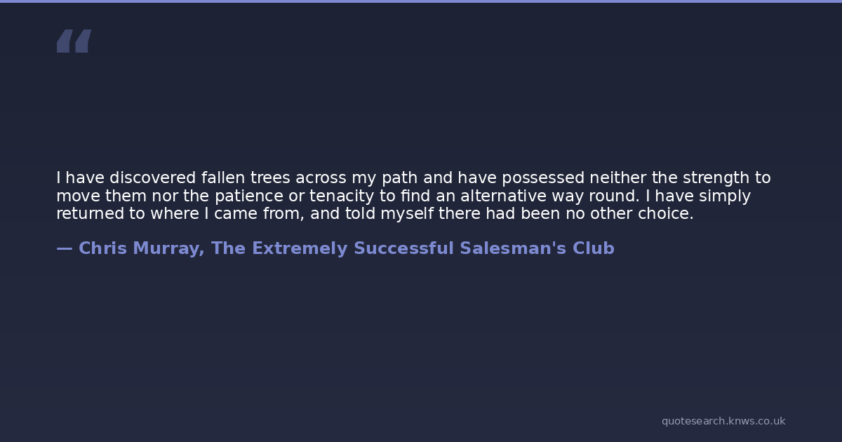I have discovered fallen trees across my path and have possessed neither the strength to move them nor the patience or tenacity to find an alternative way round. I have simply returned to where I came from, and told myself there had been no other choice.