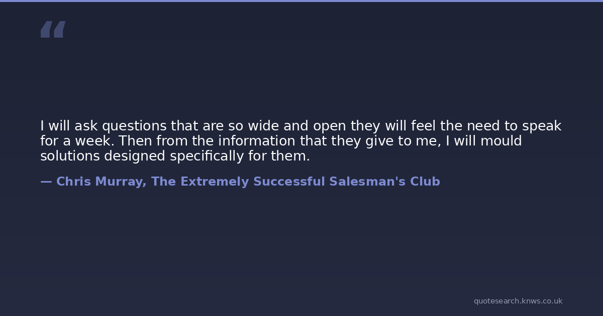 I will ask questions that are so wide and open they will feel the need to speak for a week. Then from the information that they give to me, I will mould solutions designed specifically for them.