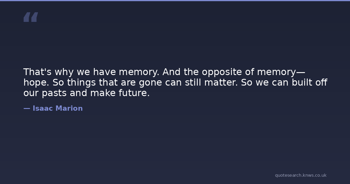 That's why we have memory. And the opposite of memory— hope. So things that are gone can still matter. So we can built off our pasts and make future.