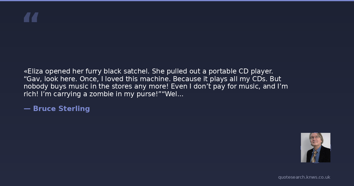 «Eliza opened her furry black satchel. She pulled out a portable CD player. “Gav, look here. Once, I loved this machine. Because it plays all my CDs. But nobody buys music in the stores any more! Even I don’t pay for music, and I’m rich! I’m carrying a zombie in my purse!”“Well, yes, that platform is obsolete now, but a new business model will arise for music.”“No it won’t! That’s a lie! Nobody will ever pay! The music business is the walking dead! Don’t lie to me.” Eliza stuffed her doomed device back in her furry purse.Gavin rubbed his chin. “Your Digital Native generation really has some issues.”»