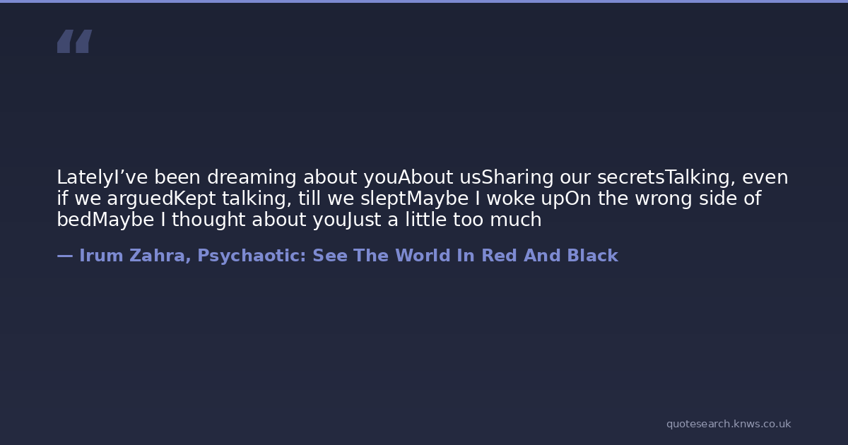 LatelyI’ve been dreaming about youAbout usSharing our secretsTalking, even if we arguedKept talking, till we sleptMaybe I woke upOn the wrong side of bedMaybe I thought about youJust a little too much
