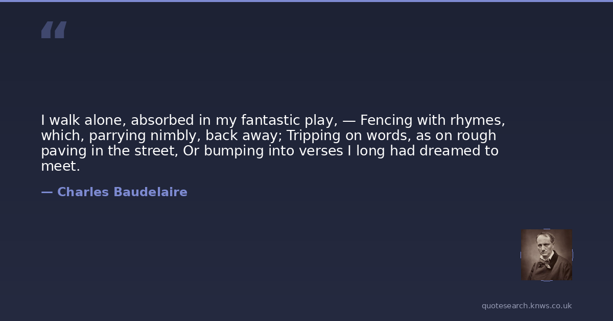 I walk alone, absorbed in my fantastic play, — Fencing with rhymes, which, parrying nimbly, back away; Tripping on words, as on rough paving in the street, Or bumping into verses I long had dreamed to meet.