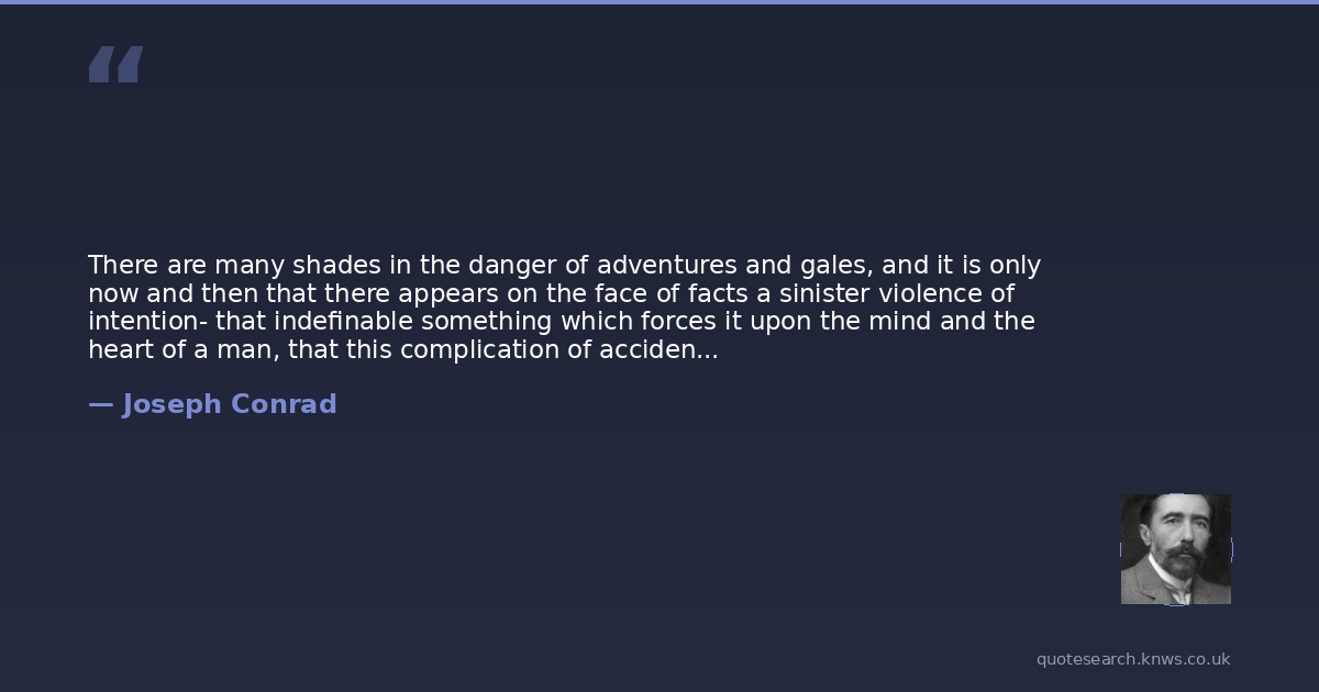 There are many shades in the danger of adventures and gales, and it is only now and then that there appears on the face of facts a sinister violence of intention- that indefinable something which forces it upon the mind and the heart of a man, that this complication of accidents or these elemental furies are coming at him with a purpose of malice, with a strength beyond control, with an unbridled cruelty that means to tear out of him his hope and his fear, the pain of his fatigue and his longing for rest: which means to smash, to destroy, to annihilate all he has seen, known, loved, enjoyed, or hated; all that is priceless and necessary- the sunshine, the memories, the future,- which means to sweep the whole precious world utterly away from his sight by the simple and appalling act of taking his life.