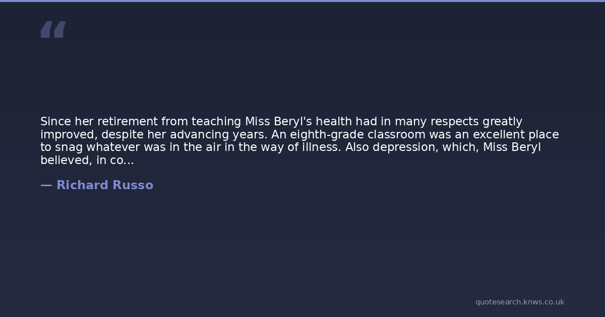 Since her retirement from teaching Miss Beryl's health had in many respects greatly improved, despite her advancing years. An eighth-grade classroom was an excellent place to snag whatever was in the air in the way of illness. Also depression, which, Miss Beryl believed, in conjunction with guilt, opened the door to illness. Miss Beryl didn't know any teachers who weren't habitually guilty and depressed--guilty they hadn't accomplished more with their students, depressed that very little more was possible.