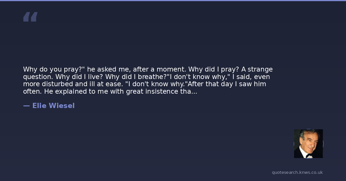 Why do you pray?" he asked me, after a moment. Why did I pray? A strange question. Why did I live? Why did I breathe?"I don't know why," I said, even more disturbed and ill at ease. "I don't know why."After that day I saw him often. He explained to me with great insistence that every question possessed a power that did not lie in the answer. "Man raises himself toward God by the questions he asks Him," he was fond of repeating. "That is the true dialogue. Man questions God and God answers. But we don't understand His answers. We can't understand them. Because they come from the depths of the soul, and they stay there until death. You will find the true answers, Eliezer, only within yourself!" "And why do you pray, Moshe?" I asked him. "I pray to the God within me that He will give me the strength to ask Him the right questions.
