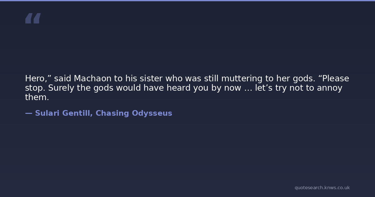 Hero,” said Machaon to his sister who was still muttering to her gods. “Please stop. Surely the gods would have heard you by now … let’s try not to annoy them.
