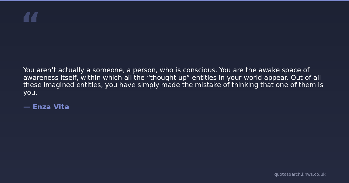 You aren’t actually a someone, a person, who is conscious. You are the awake space of awareness itself, within which all the “thought up” entities in your world appear. Out of all these imagined entities, you have simply made the mistake of thinking that one of them is you.