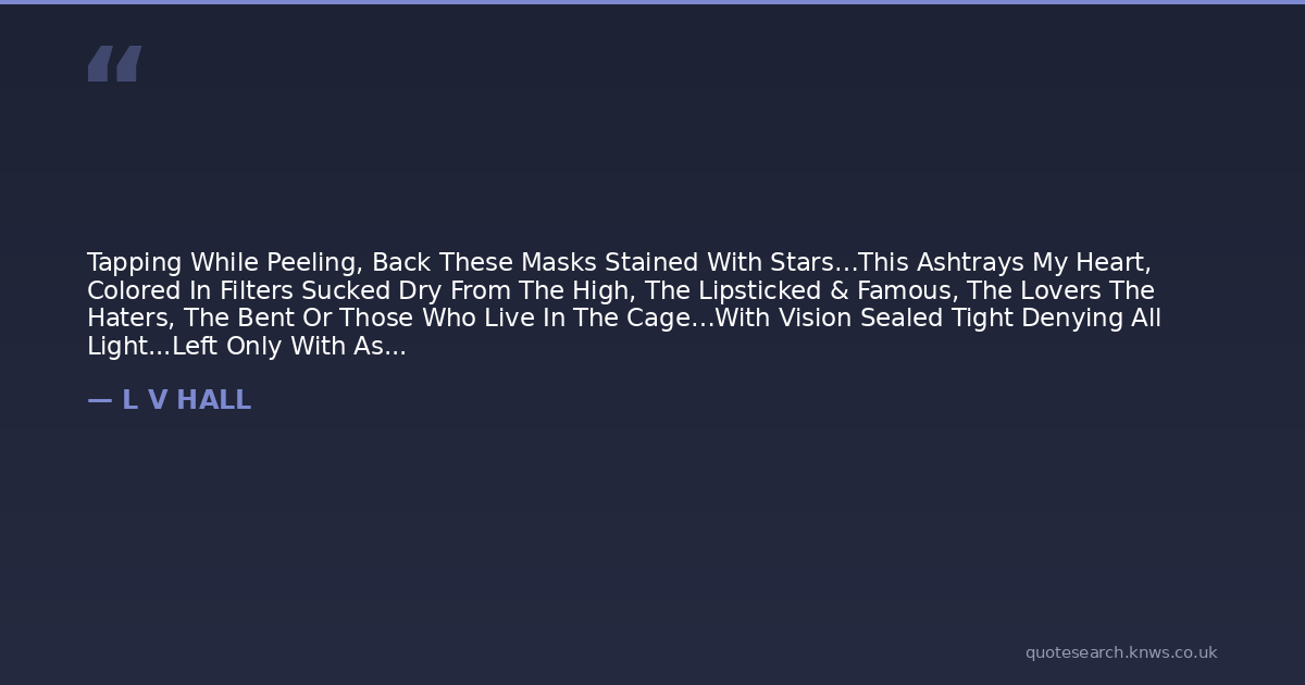 Tapping While Peeling, Back These Masks Stained With Stars…This Ashtrays My Heart, Colored In Filters Sucked Dry From The High, The Lipsticked & Famous, The Lovers The Haters, The Bent Or Those Who Live In The Cage…With Vision Sealed Tight Denying All Light...Left Only With Assumption From A Judge In Sleep State...