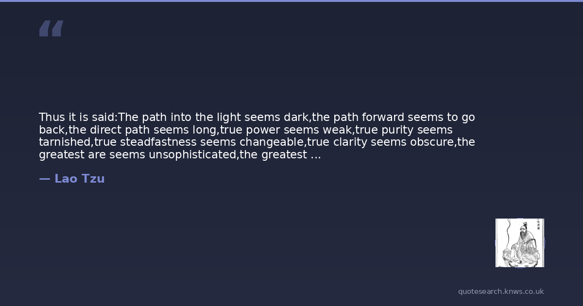 Thus it is said:The path into the light seems dark,the path forward seems to go back,the direct path seems long,true power seems weak,true purity seems tarnished,true steadfastness seems changeable,true clarity seems obscure,the greatest are seems unsophisticated,the greatest love seems indifferent,the greatest wisdom seems childish.The Tao is nowhere to be found.Yet it nourishes and completes all things.