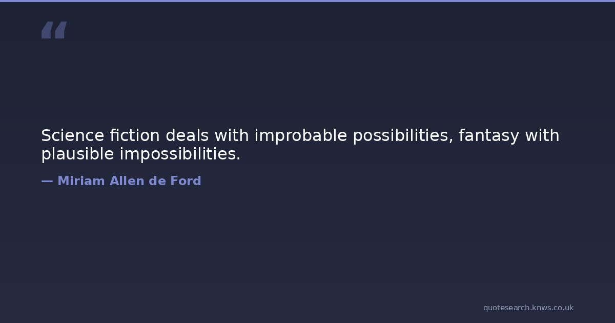 Science fiction deals with improbable possibilities, fantasy with plausible impossibilities. differences fantasy science-fiction Download Image Share on X Share on Facebook Copy Link