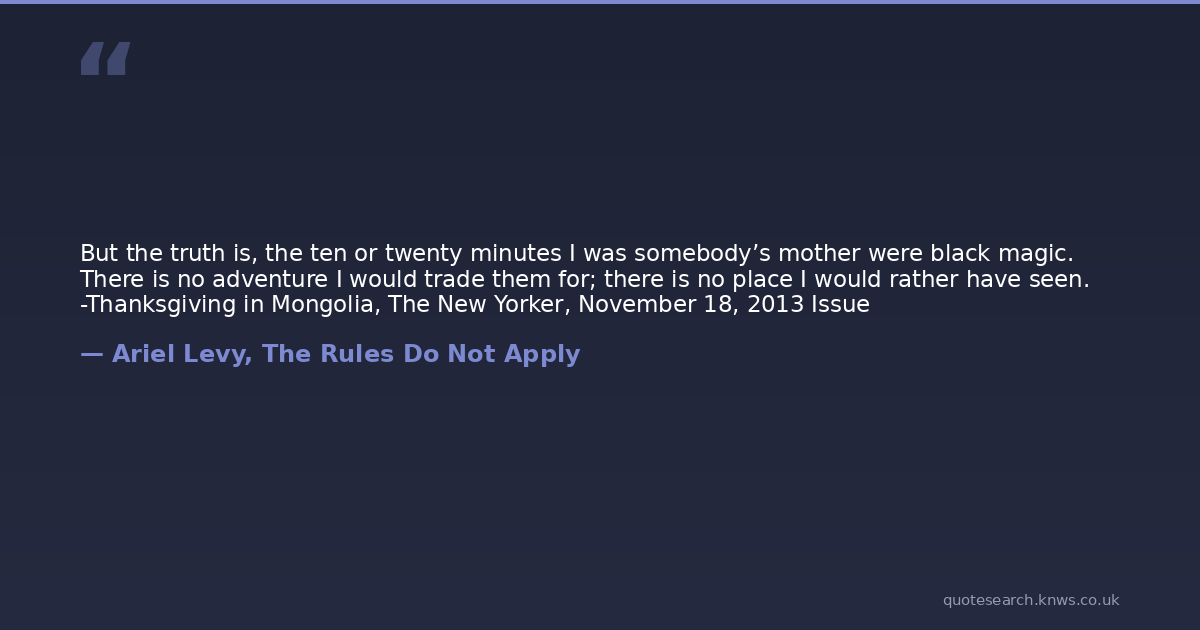 But the truth is, the ten or twenty minutes I was somebody’s mother were black magic. There is no adventure I would trade them for; there is no place I would rather have seen. -Thanksgiving in Mongolia, The New Yorker, November 18, 2013 Issue