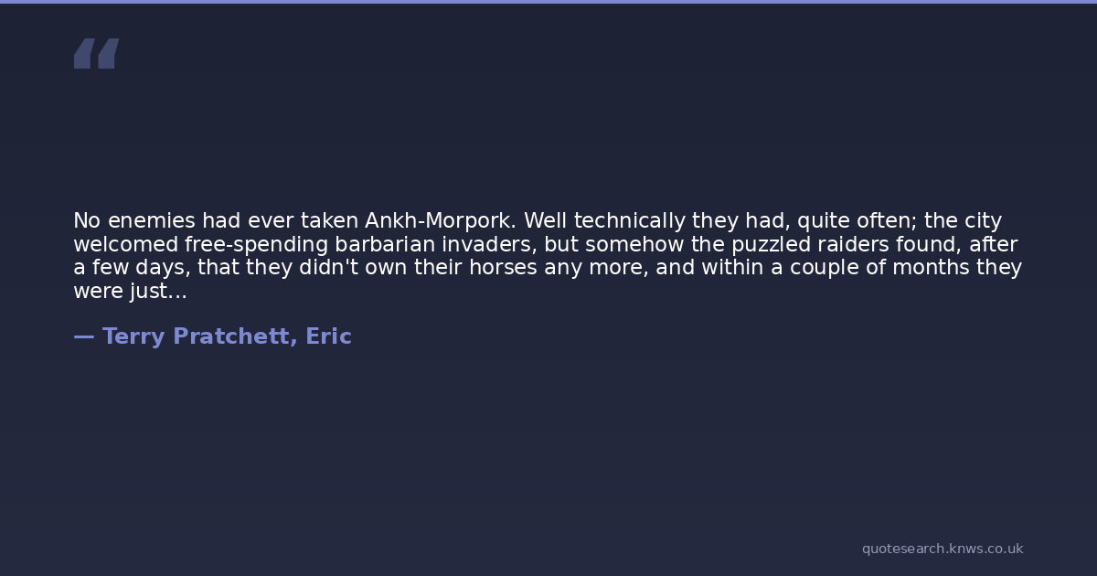 No enemies had ever taken Ankh-Morpork. Well technically they had, quite often; the city welcomed free-spending barbarian invaders, but somehow the puzzled raiders found, after a few days, that they didn't own their horses any more, and within a couple of months they were just another minority group with its own graffiti and food shops.