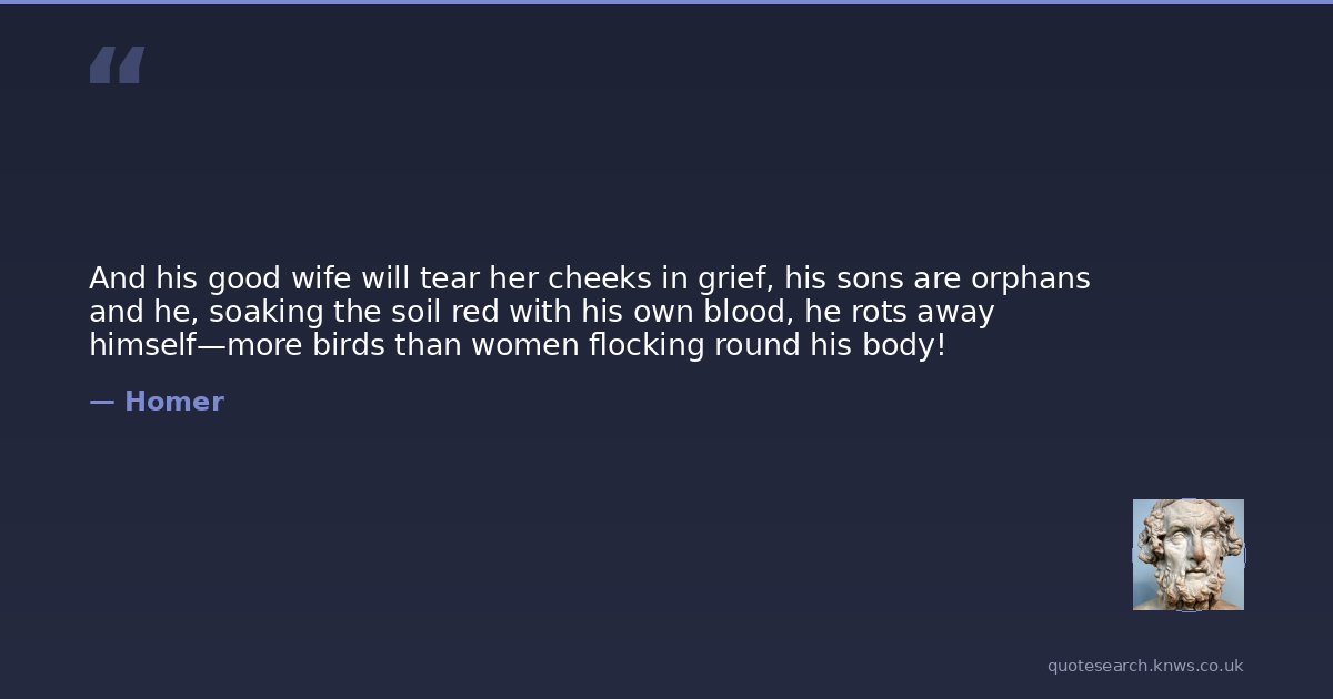 And his good wife will tear her cheeks in grief, his sons are orphans and he, soaking the soil red with his own blood, he rots away himself—more birds than women flocking round his body!