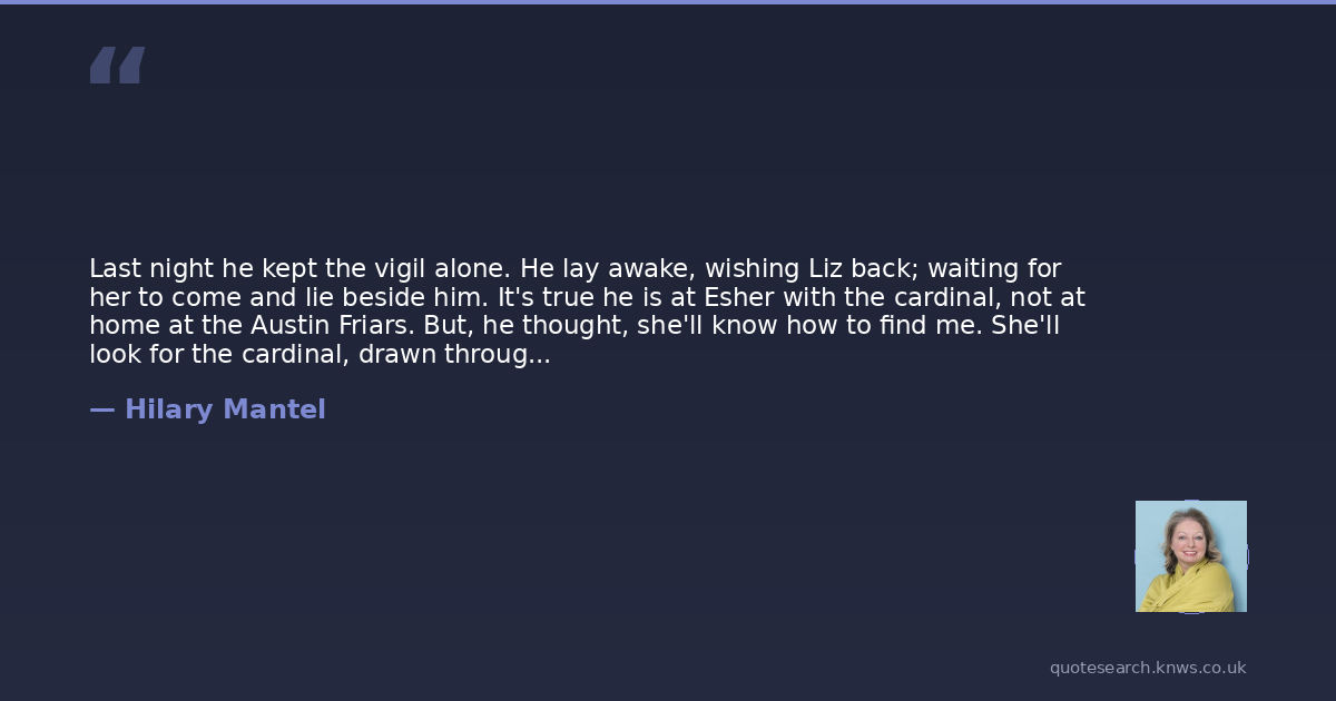 Last night he kept the vigil alone. He lay awake, wishing Liz back; waiting for her to come and lie beside him. It's true he is at Esher with the cardinal, not at home at the Austin Friars. But, he thought, she'll know how to find me. She'll look for the cardinal, drawn through the space between worlds by incense and candlelight. Whereever the cardinal is, I will be.