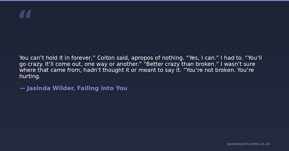 You can’t hold it in forever,” Colton said, apropos of nothing. “Yes, I can.” I had to. “You’ll go crazy. It’ll come out, one way or another.” “Better crazy than broken.” I wasn't sure where that came from, hadn't thought it or meant to say it. “You’re not broken. You’re hurting.