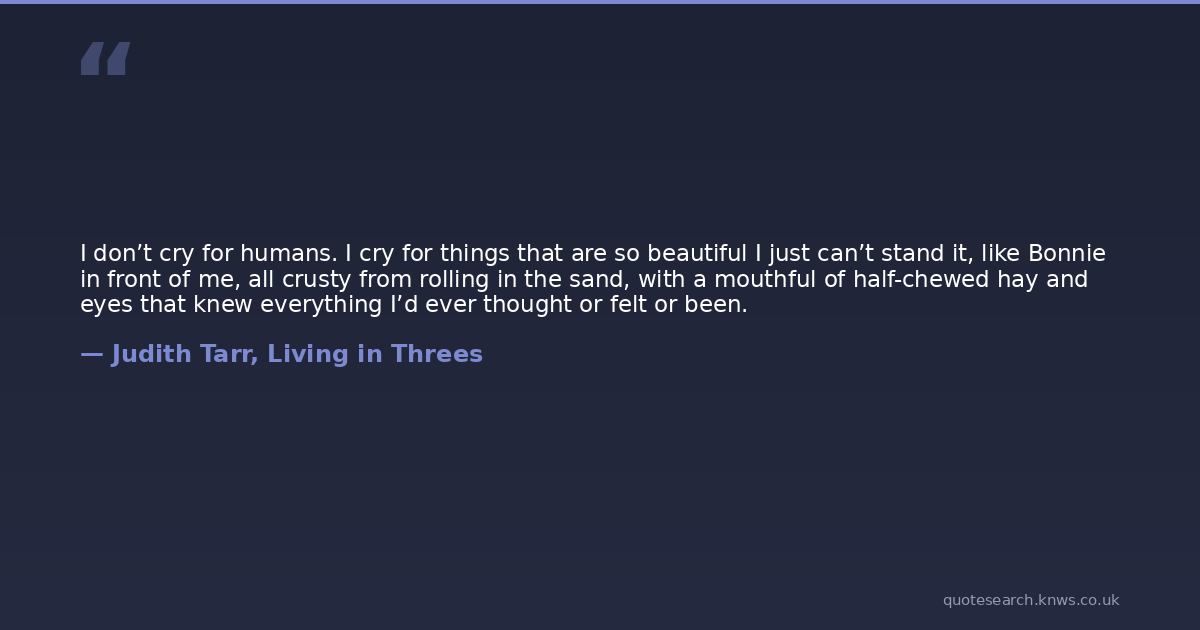I don’t cry for humans. I cry for things that are so beautiful I just can’t stand it, like Bonnie in front of me, all crusty from rolling in the sand, with a mouthful of half-chewed hay and eyes that knew everything I’d ever thought or felt or been.