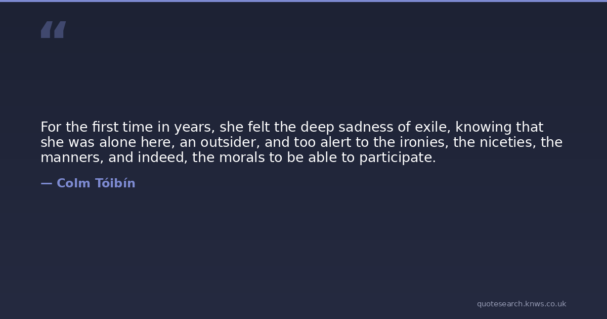 For the first time in years, she felt the deep sadness of exile, knowing that she was alone here, an outsider, and too alert to the ironies, the niceties, the manners, and indeed, the morals to be able to participate.