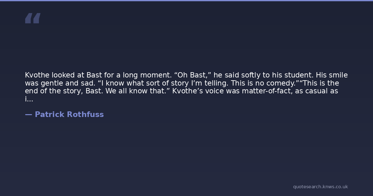 Kvothe looked at Bast for a long moment. “Oh Bast,” he said softly to his student. His smile was gentle and sad. “I know what sort of story I’m telling. This is no comedy.”“This is the end of the story, Bast. We all know that.” Kvothe’s voice was matter-of-fact, as casual as if he were describing yesterday’s weather. “I have led an interesting life, and this reminiscence has a certain sweetness to it. But . . .”Kvothe drew a deep breath and let it out gently. “. . . but this is not a dashing romance. This is no fable where folk come back from the dead. It’s not a rousing epic meant to stir the blood. No.We all know what kind of story this is.