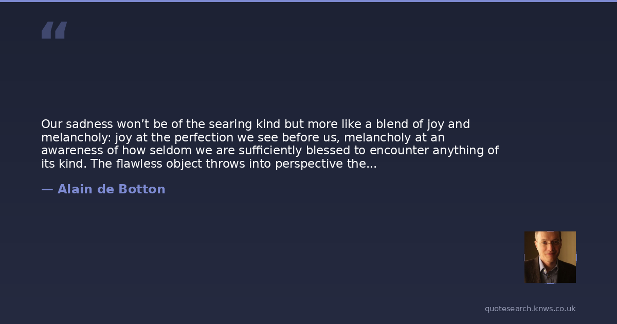 Our sadness won’t be of the searing kind but more like a blend of joy and melancholy: joy at the perfection we see before us, melancholy at an awareness of how seldom we are sufficiently blessed to encounter anything of its kind. The flawless object throws into perspective the mediocrity that surrounds it. We are reminded of the way we would wish things always to be and of how incomplete our lives remain.