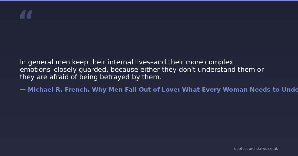 In general men keep their internal lives–and their more complex emotions–closely guarded, because either they don't understand them or they are afraid of being betrayed by them.